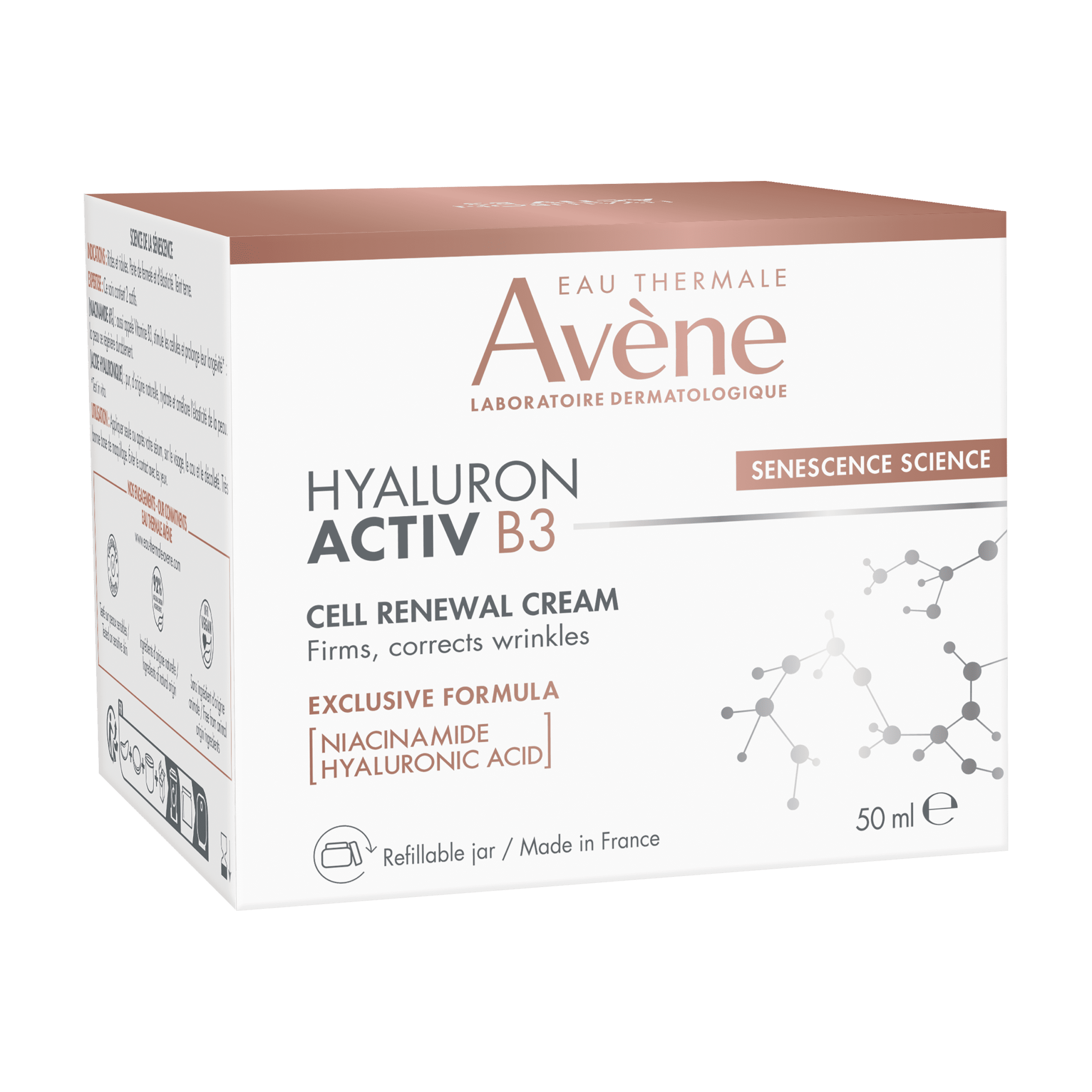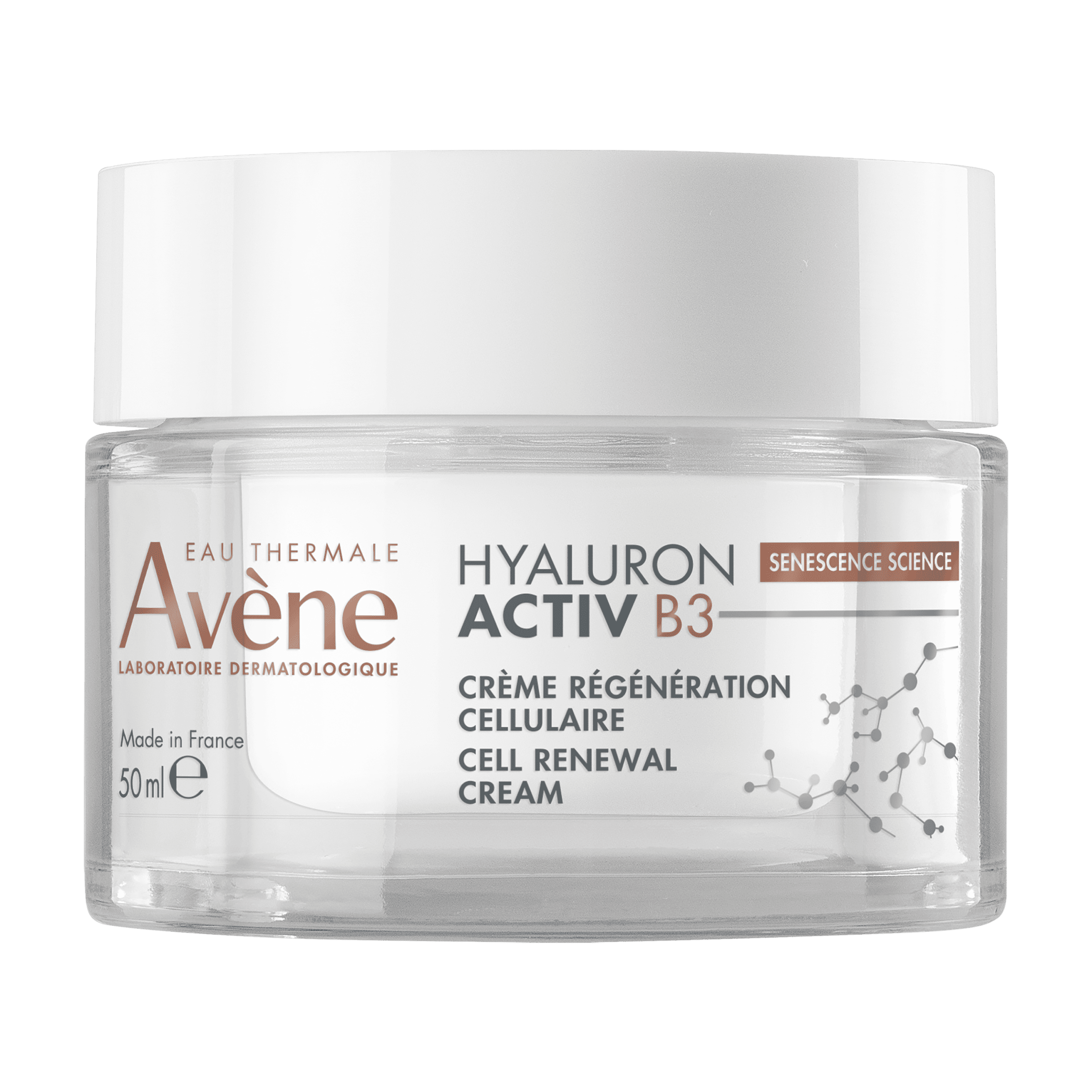 S godinama se sve ubrzava. Stanice stare, ali i šire ovu pojavu oko sebe. Time se dodatno ubrzava starenje kože. Dermatološki laboratoriji Avène stvorili su Hyaluron Activ B3 Kremu za obnovu stanica koja sadrži 0,2% čiste hijaluronske kiseline (visoke i srednje molekularne težine) i niacinamid (6%) za djelovanje na uzrok starenja i produljenje života stanica*. Koža je zategnuta, zaglađenija i blistava već nakon prvog nanošenja. Nakon 2 tjedna, koža je obnovljena, čvršća, a bore su smanjene**. Njezina baršunasta tekstura nježnog mirisa pruža ugodu koži. Također je jako dobra podloga za šminku. Avene Hyaluron Activ B3 Krema za obnovu stanica je eko-dizajnirani proizvod za njegu kože koji sadrži 92% sastojaka prirodnog podrijetla i dolazi u staklenoj teglici koja se može ponovno napuniti.