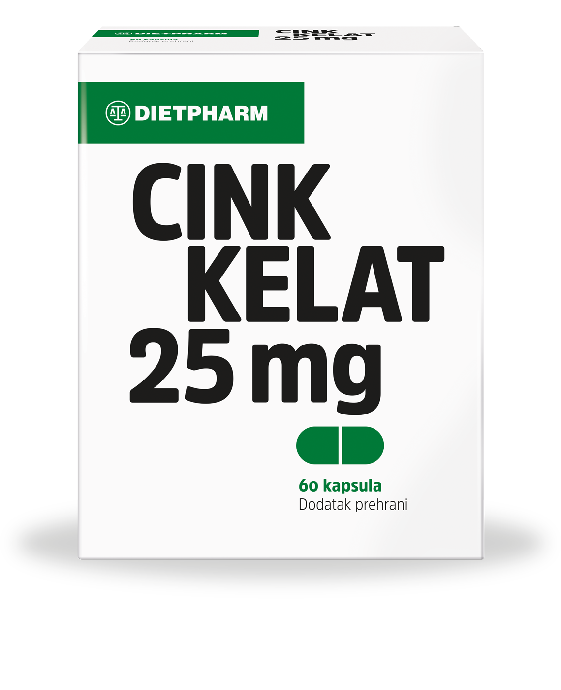 Dietpharm Cink Kelat 25 mg kapsule su dodatak prehrani koji sadrži 25 mg cinka u obliku cinkovog glukonata. Cinkov glukonat je kelirani oblik cinka koji se odlično apsorbira u organizmu.