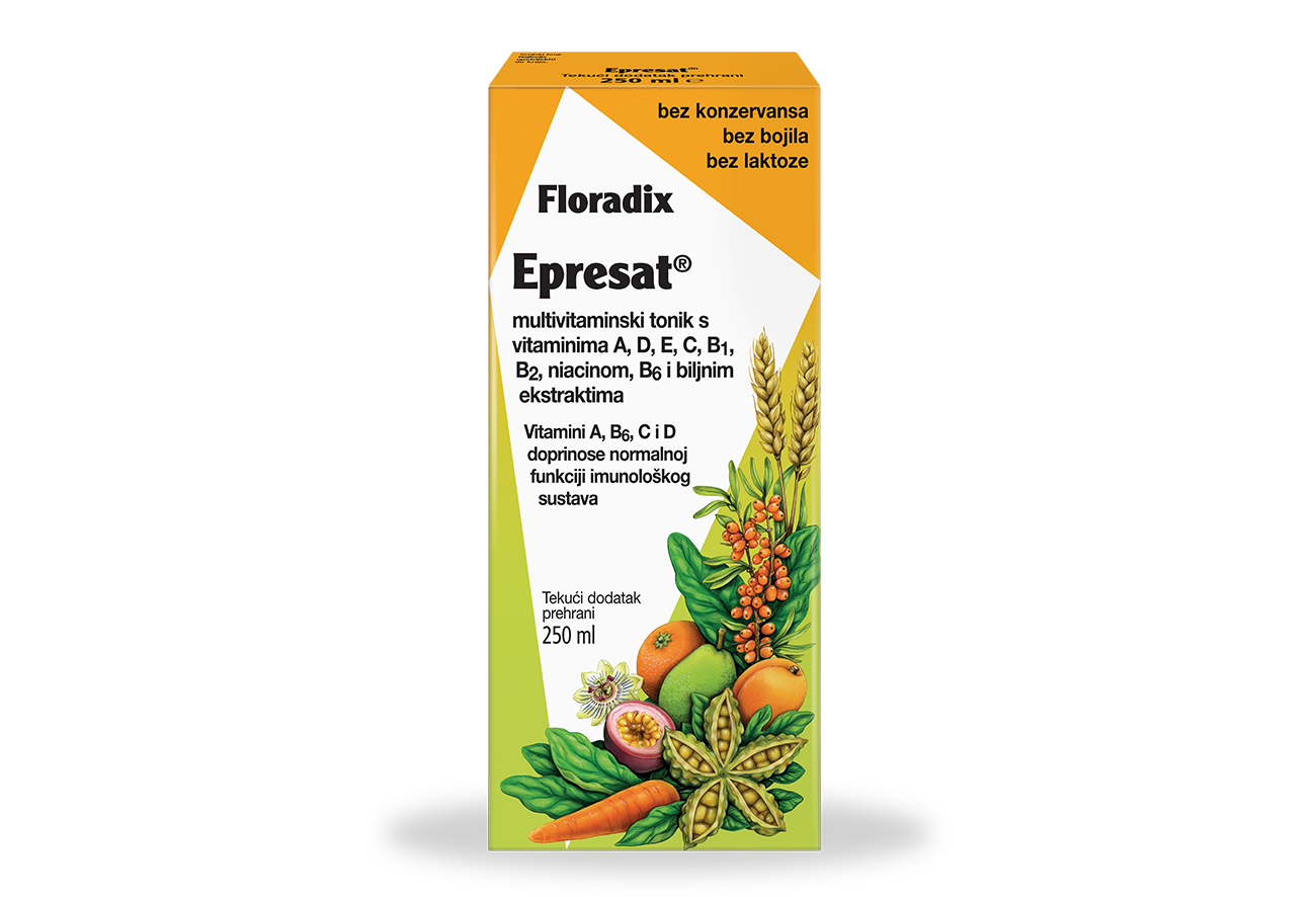 Floradix Epresat je tekući pripravak jednostavan za uzimanje, a sadrži uravnoteženi omjer vitamina A, D, E, C, B1, B2, niacina i B6.