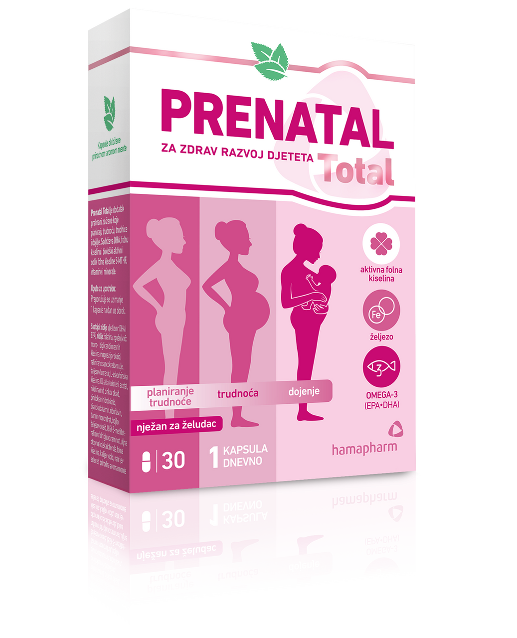 Prenatal Total je dodatak prehrani koji sadrži aktivnu folnu kiselinu, DHA i EPA te pažljivo odabrane vitamine i minerale za optimalnu podršku zdravlju majke i pravilan razvoj djeteta.