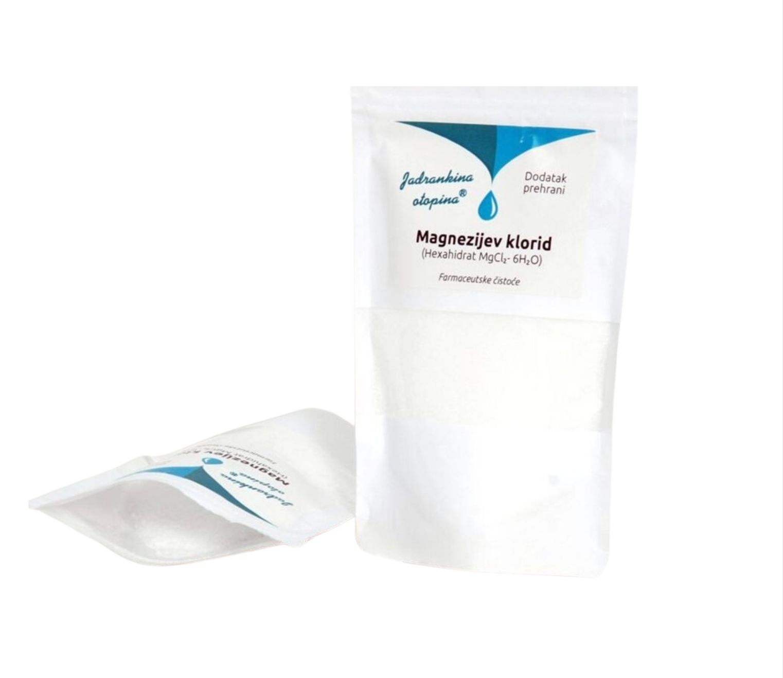 Magnezij klorid heksahidrat u prahu prirodan je dodatak prehrani visoke farmaceutske čistoće iz linije Jadrankine otopine. Uz sprej, dostupan je i u obliku praha za unutarnju i vanjsku primjenu. Ovaj ekološki čist proizvod doprinosi normalnoj funkciji mišića, smanjenju umora i iscrpljenosti te oporavku organizma tijekom stresa i fizičkog napora. Povoljno djeluje na zdravlje kostiju i zubi, podržava krvožilni sustav i imunološki odgovor te pomaže kod glavobolja, menstrualnih tegoba i napetosti. Doprinosi zaštiti od osteoporoze, reumatskih i artritičnih tegoba te podiže razinu energije i vitalnosti.