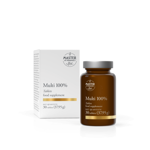 Multivitaminski mineralni proizvod Master of Pharmacy Multi 100% tablete izvor su esencijalnih vitamina i minerala u 100 % preporučenom dnevnom unosu.