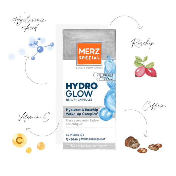 Vrijeme je da probudite svoju kožu i podarite joj svjež sjaj iznutra. Merz Spezial Hydro Glow Beauty kapsule sadrže važne nutrijente za prekrasno blistavu kožu. Vitamin C štiti od oksidativnog stresa, i djeluje zajedno s poznatim sastojcima za ljepotu – hijaluronskom kiselinom i ekstraktom šipka.