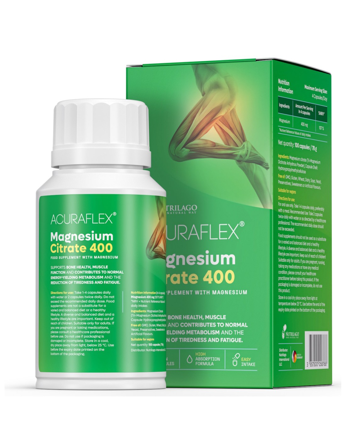 ACURAFLEX Magnezijev citrate 400 sadrži 400 mg elementarnog magnezija po 4 kapsule, formuliran za visoku bioraspoloživost.