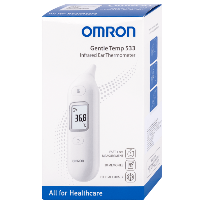 Omron Gentle Temp 533 je napredni infracrveni ušni toplomjer koji omogućuje iznimno brzo i pouzdano mjerenje temperature u samo 1 sekundi. Dizajniran za jednostavnu, higijensku i održivu svakodnevnu upotrebu – bez dodatnih potrošnih dijelova.