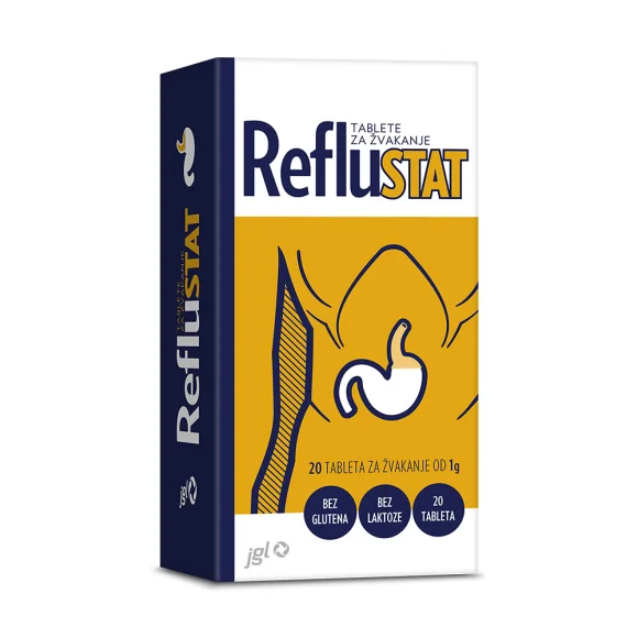 REFLUSTAT tablete za žvakanje (20 tableta) učinkovito ublažavaju simptome gastroezofagealnog refluksa zahvaljujući trostrukom djelovanju: blokiraju povrat želučane kiseline, smanjuju žgaravicu i štite sluznicu jednjaka. Formulacija na bazi natrijevog alginata stvara zaštitni gel koji djeluje kao fizička barijera protiv refluksa, dok karbonati smanjuju kiselost želuca. RefluSTAT tablete pomažu kod žgaravice, refluksnog ezofagitisa, probavnih smetnji i noćnih simptoma refluksa te su pogodne i za primjenu tijekom trudnoće. Bez glutena i laktoze.