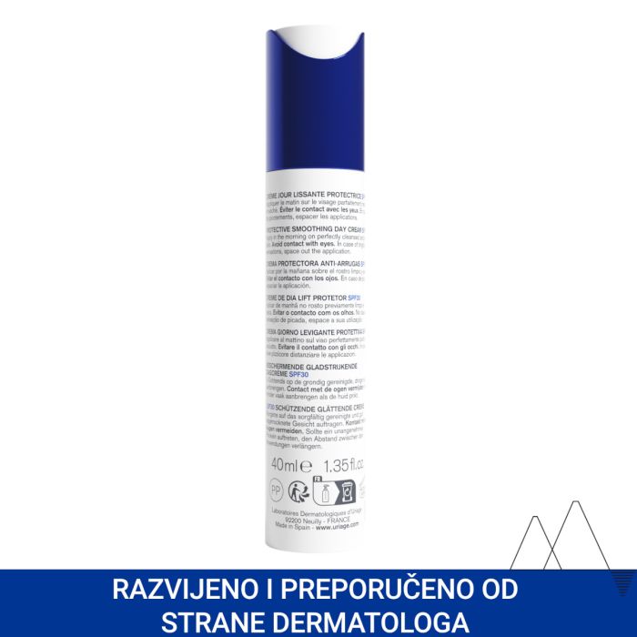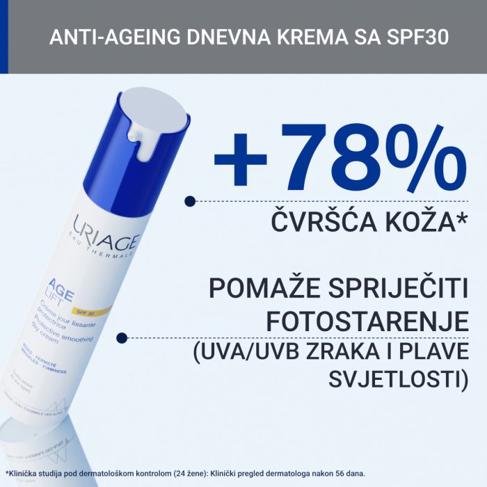 Inovacija AGE LIFT učvršćujuća zaglađujuća dnevna krema SPF30, dermatološki asortiman lifting tretmana koji zaglađuje i učvršćuje sve tipove kože, čak i osjetljivu [3X manje bora, 3X više čvrstoće] * . Uriage AGE LIFT učvršćujuća zaglađujuća dnevna krema SPF30 istovremeno djeluje na bore, čvrstoću i na svakodnevne agresije kojima je koža izložena: plavo svjetlo, UV zrake, zagađenje, stres, umor. Koža lica je glatkija, čvršća, zaglađenija. Konture lica su bolje definirane. Koža je bolje zaštićena od preranog starenja i pigmentnih mrlja.