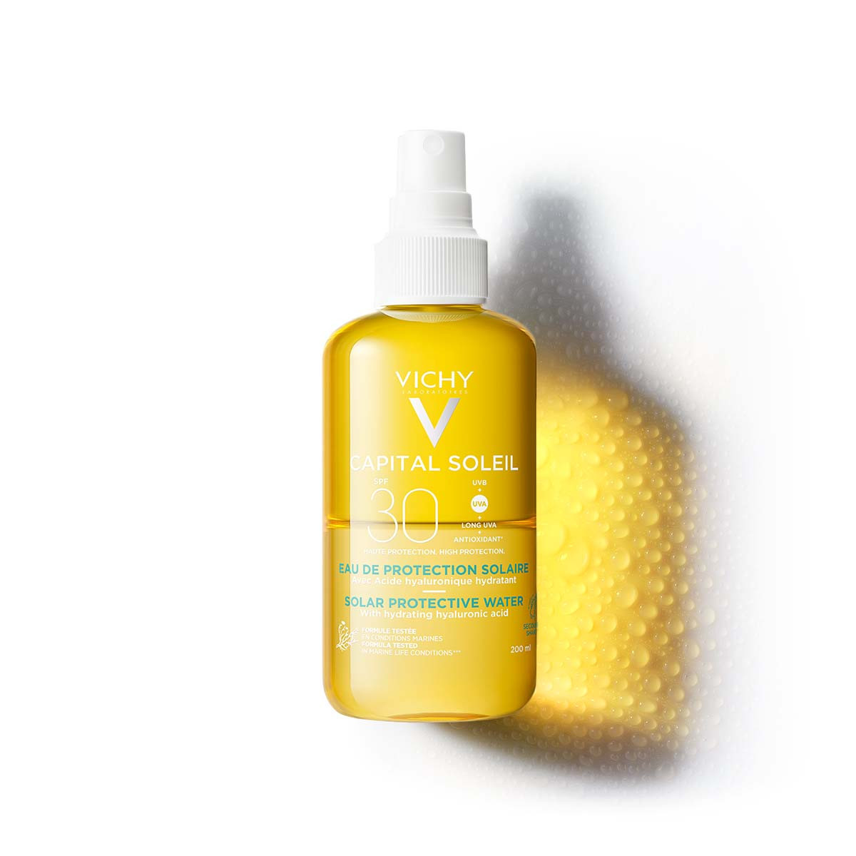 Vichy Capital Soleil Hidratantna vodica za sunčanje SPF30 pruža visoku zaštitu od UVA i UVB zraka u inovativnoj, ultra laganoj vodenoj teksturi. Ova dvofazna formula kombinira osvježavajući osjećaj vode s učinkovitošću klasične kreme za sunčanje, dok hijaluronska kiselina i Vichy vulkanska voda intenzivno hidratiziraju kožu. Ne ostavlja bijele tragove, brzo se upija i pogodna je za lice i tijelo te sve tipove kože, uključujući osjetljivu.
